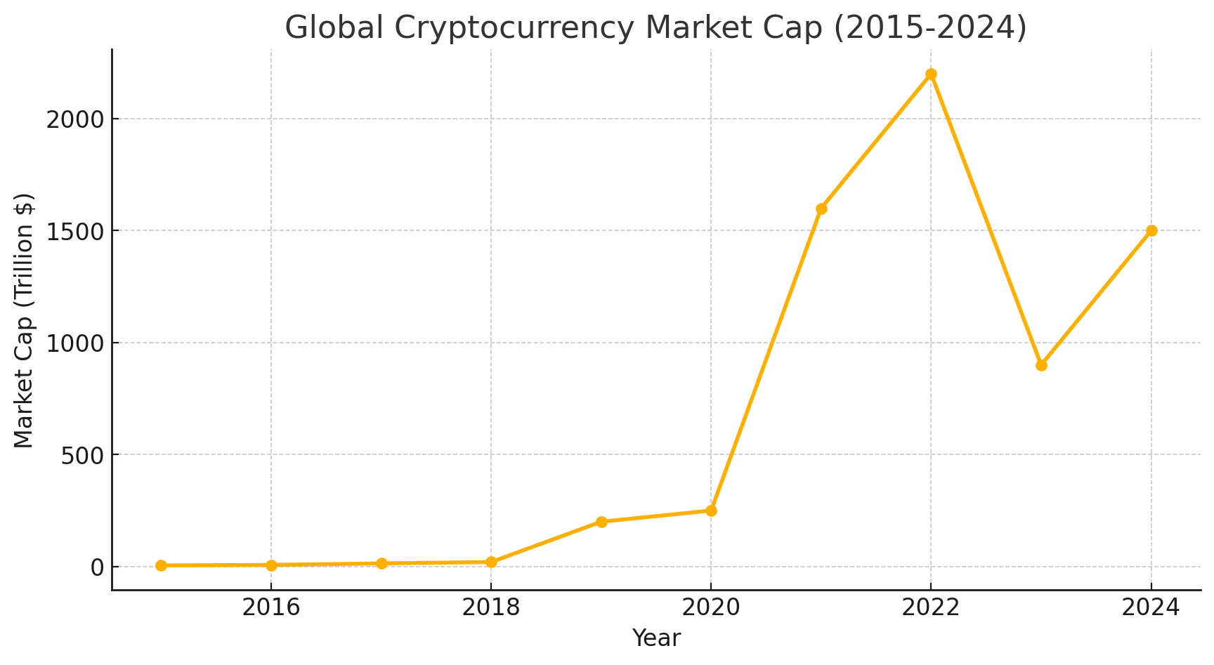 위 그래프는 2015년부터 2024년까지의 암호화폐 시가총액 변화를 보여준다.